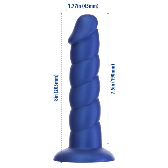 Deze elegante 8-inch dong heeft een prachtige indigoblauwe tint met een uniek geribbelde textuur die langs de schacht loopt en is bekroond met een prominente kop voor penetratie. De enorme omvang van dit product neemt je mee naar een andere dimensie... Maar de fantasie stopt niet alleen bij het uiterlijk! Dit product is gemaakt van 100% siliconen, voelt zijdezacht aan op de huid en is 100% gecertificeerd lichaamsveilig voor gebruik op al je gevoelige zones.