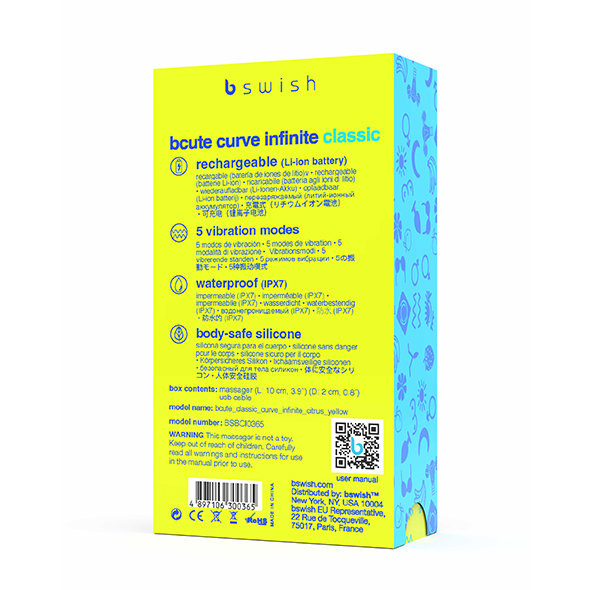 Geef je over aan de onweerstaanbare allure van dit schatje, een krachtpatser. Zet je schrap voor een koor van "Meer, alsjeblieft!" terwijl dit verleidelijke wonder zijn magie uitoefent op je G-spot en clitoris. Boordevol vitamine 'O' en 5 intensiteitsniveaus, de genotmogelijkheden lijken grenzeloos. Zeg vaarwel tegen baJeries - Ze is magnetisch oplaadbaar via USB. Of het nu regent of zonnestralen zijn, de IPX7 waterproof certificering zorgt voor ononderbroken plezier, zelfs in de weJste omgevingen (knipoog knipoog). wees gerust met 100% lichaamsveilige materialen en zeg hallo tegen je nieuwe belangrijkste squeeze, de bcute curve infinite classic verkrijgbaar in citrusgeel & elektrisch blauw.