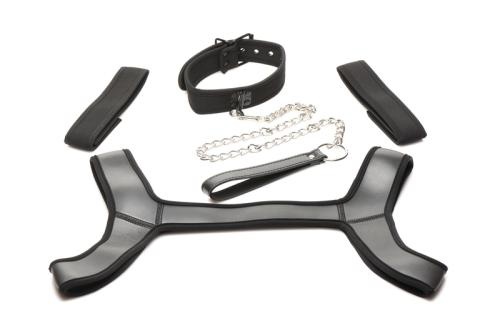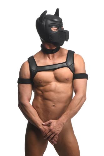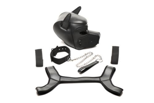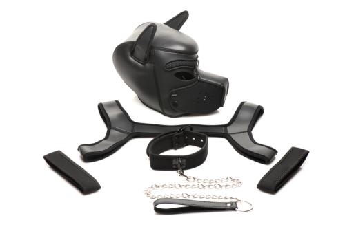 Deze complete Puppy Set is perfect voor een kinky bdsm spel! De set bestaat uit een hood, een halsband en riem, armbanden en een harnas.