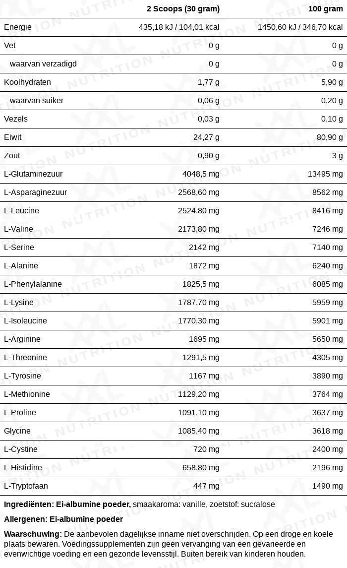 Egg Protein van XXL Nutrition is het resultaat van een kwalitatief hoogwaardig en zuiver filterproces. Tijdens dit proces wordt het eiwit van het ei geïsoleerd, gedroogd en vervolgens verwerkt tot een heel fijn poeder (ei-albumine) dat supersnel door het lichaam opgenomen kan worden. Dit betekent het hoogst mogelijke percentage eiwitten, een minimale hoeveelheid koolhydraten en geen grammetje vet.