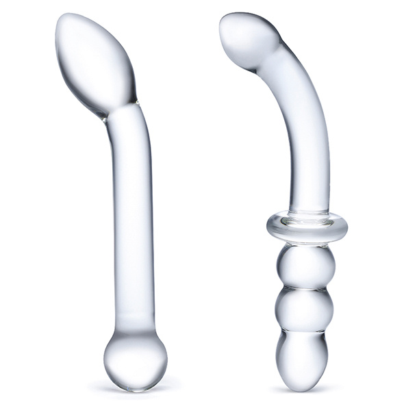 Haal het meeste uit je G-spot-verkenning met twee gladde glazen dildo's die gebogen zijn voor gerichte stimulatie. Deze set bevat een klassieke G-spot dildo met een bolvormige, taps toelopende punt voor het soepel in brengen en een dubbele dildo met een geribbeld uiteinde dat ook dient als uitstekende handgreep.