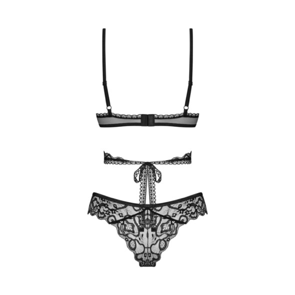 Verhoog je intieme momenten met deze verfijnde lingerieset. De kanten bh en slip combineren delicate patronen met gladde, transparante stof. Het minimalistische ontwerp benadrukt je subtiele charme met een vleugje verfijning, perfect voor romantische avonden.