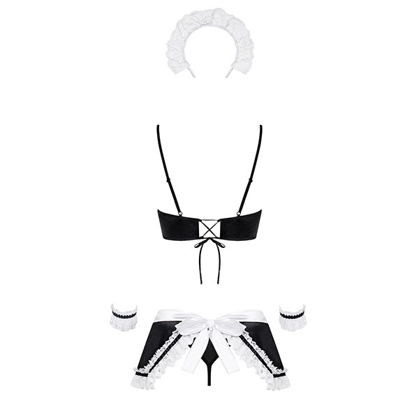 Dit dienstmeisje kostuum staat charmant bij elke vrouw. De set bestaat uit een haarband, een top, een rok, een string en polsbandjes. De top heeft een vetersluiting op de rug om perfect naar het figuur te passen. De rok heeft de vorm van een schort, de rug is open met een grote witte strik. De top en rok hebben witte kanten franjes die een gevoel van betrouwbaarheid geven.