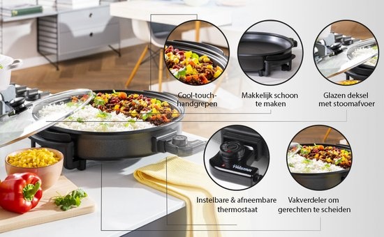 Het afneembare deksel, uitgerust met een transparante bovenkant en een stoomuitlaat, biedt een extra dimensie aan je kookervaring. De thermostaat, gemonteerd op een afneembaar snoer, geeft je de vrijheid om de temperatuur naar wens aan te passen. Bovendien houden de powerindicatielampjes je op de hoogte van de operationele status.