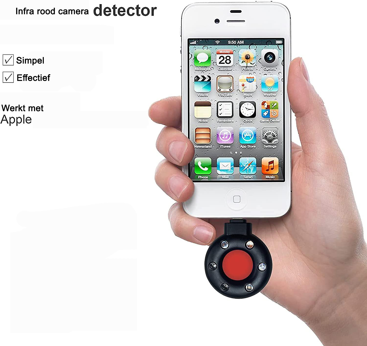 Eenvoudig te gebruiken Als u de telefoon aansluit, wordt het IR-filter automatisch ingeschakeld en wordt het flikkeren van de cameralens gedetecteerd met het blote oog om te bevestigen dat de verborgen verdachte items verborgen zijn. Met een ronde zoeker waarmee u met uw ogen naar verborgen infra rood camera's kunt zoeken, ongeacht de verborgen camera is aan of uit, je ziet rood licht wanneer de camera wordt gedetecteerd.